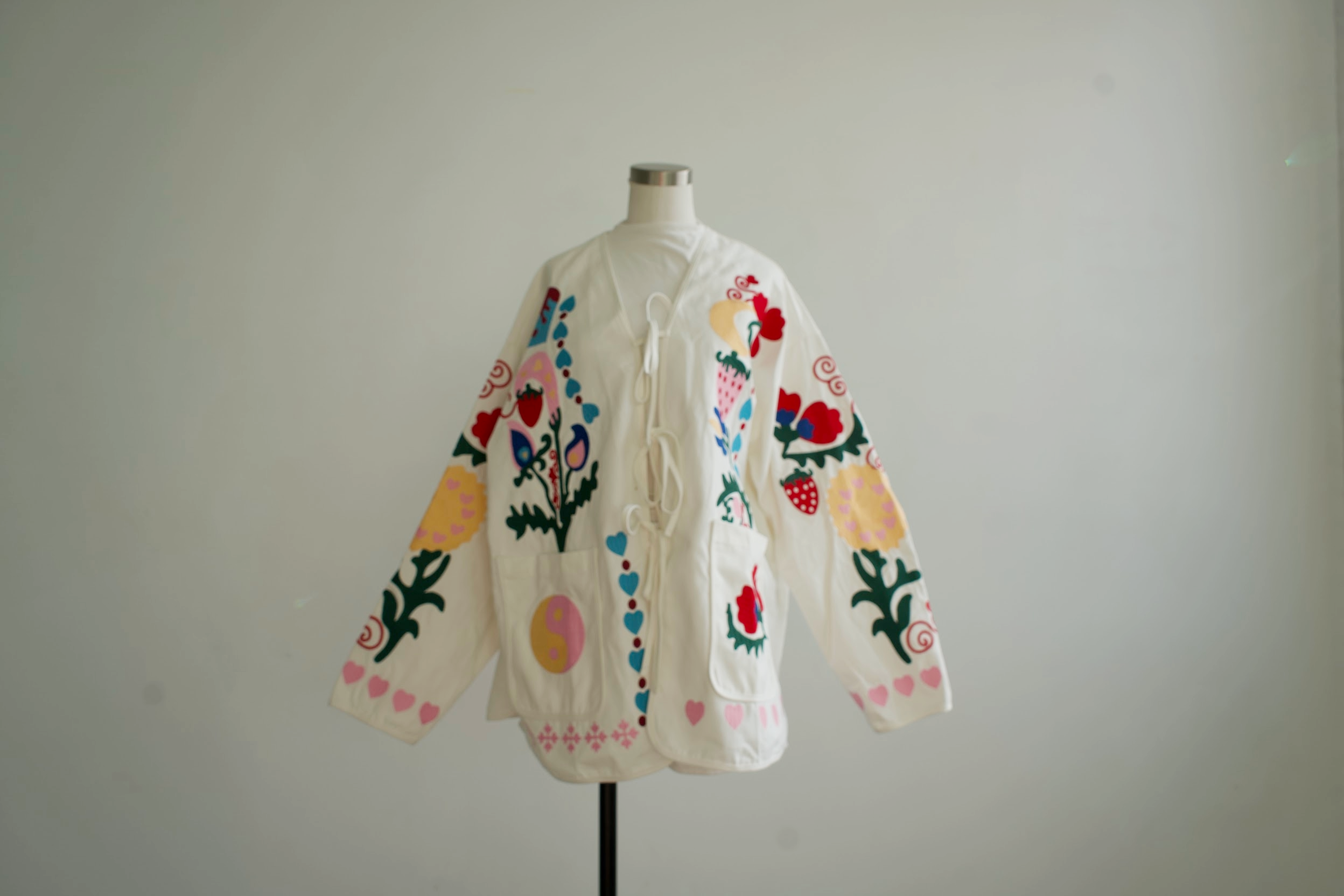 Add playful charm to your wardrobe with this Multicolor Embroidered Kimono Jacket. Crafted from a soft off-white fabric, this open-front piece features vibrant, folk-inspired embroidery across the front, sleeves, and pockets—showcasing florals, fruit motifs, and hearts in bold colors. The oversized fit and long sleeves offer relaxed comfort, while adjustable tie-front closures provide flexible styling. Perfect for layering over basics or styled as a statement piece, this jacket blends artistic expression with everyday ease.